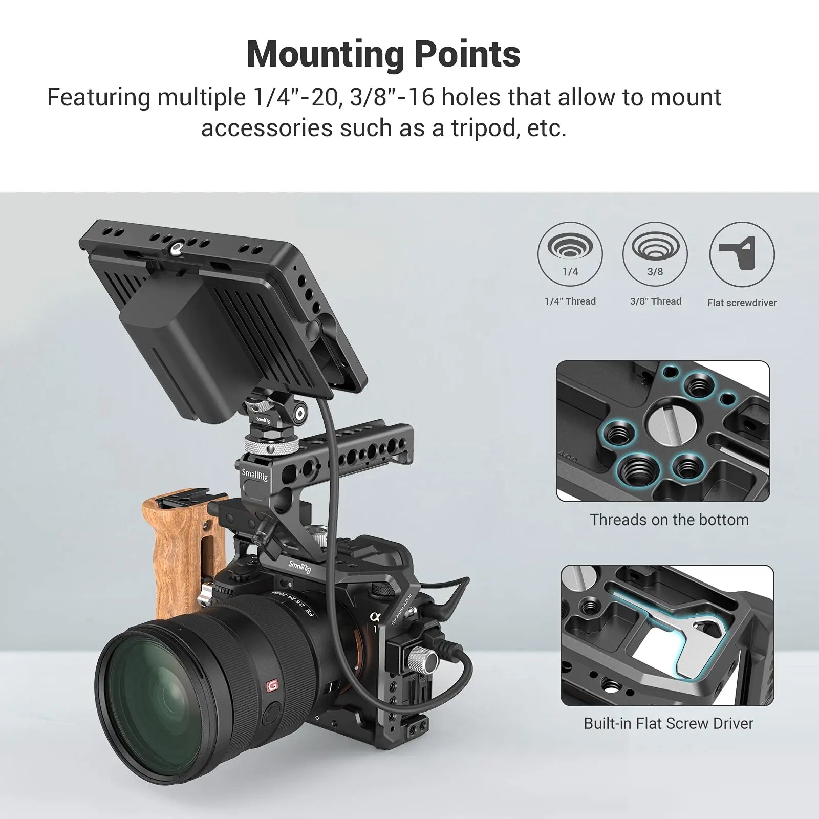 SmallRig Camera Cage for Sony Alpha 7S III 2999 maintains access to the camera's controls and features a variety of mounting options. In addition to one cold shoe mount and multiple 1/4"-20 and 3/8"-16 threaded holes, this formfitting aluminum cage features several ARRI-style mounts for preventing accessories from twisting when mounted on the cage. The cage also incorporates an anti-twist design with an M2.5 screw fixed to the strap hole in addition to the 1/4"-20 camera mounting screw so your camera can't move around in the cage. You can attach SmallRig Top Handle 1984 or SmallRig Wooden Side Handle 2093 for hand-held shooting, and SmallRig Cable Clamp 3000 to protect the HDMI cable and port. ARRI-style mounts on the top and side are provided to attach SmallRig ARRI Locating Handle 2165 or SmallRig Ball Head Magic Arm 2115. It also comes with a built-in NATO rail on the left of the cage. Mounting holes on the front allow mounting a separately available lens adapter 2219 or 1764. Strap holes are included to add a separately available wrist strap PAC2456、PSW2398 or neck strap PSC2428 to your rig. Besides, a screwdriver is built into the bottom of the cage for tightening the camera screws.