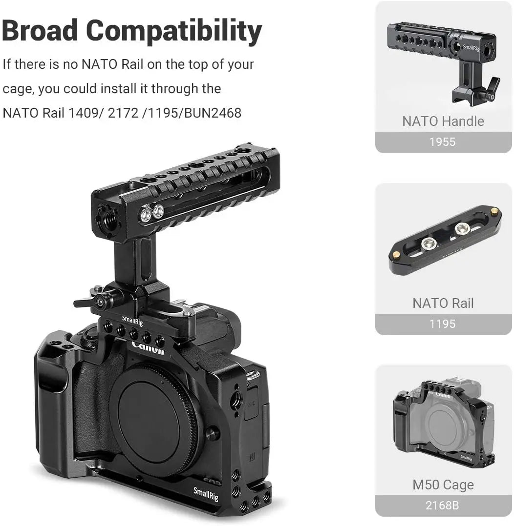 SmallRig DSLR Action NATO Handle 1955 is a sliding top handle for moving shoots. It is designed for quick release attaching and detaching on the camera without screws. Simply slide onto Safety NATO Rail and tighten down the thumbscrew. Except for sliding it from left to right on the Rail to keep your camera balanced, you can also slide it forwards and backwards to find the balance point of your rigs.