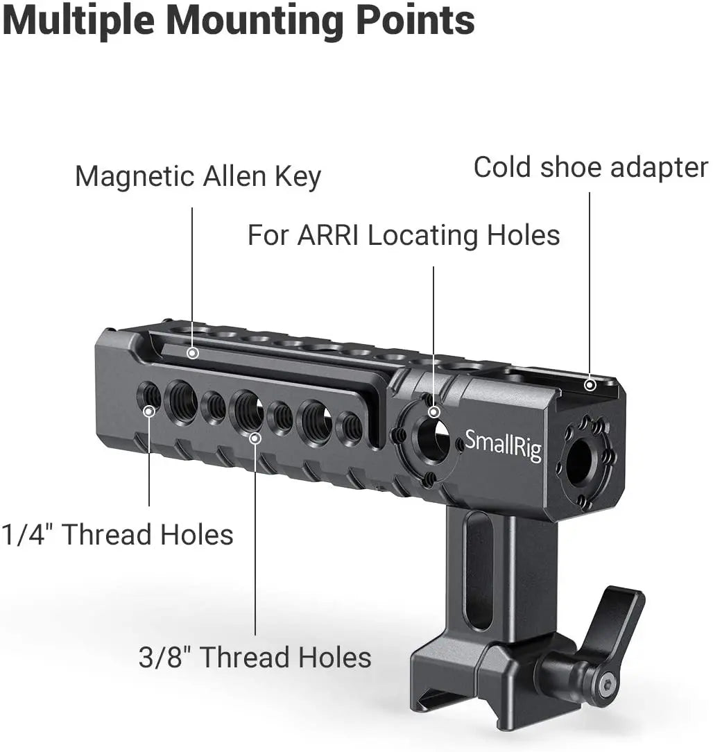 The handle is equipped with two shoe mounts on the top and at the back respectively, to which the light accessories, such as microphone, magic arm, could be attached. This handle is equipped with the hole pattern for ARRI accessory mount pins, so you can attach ARRI compatible extension blocks. The grip provides 1/4’’ & 3/8’’ mounting points for additional accessories. Additionally, we specially offer a 1/4’’ spanner for free access. It is quite convenient when you need to improve the camera and rigs balance.