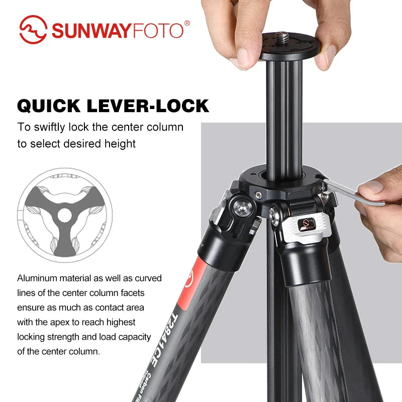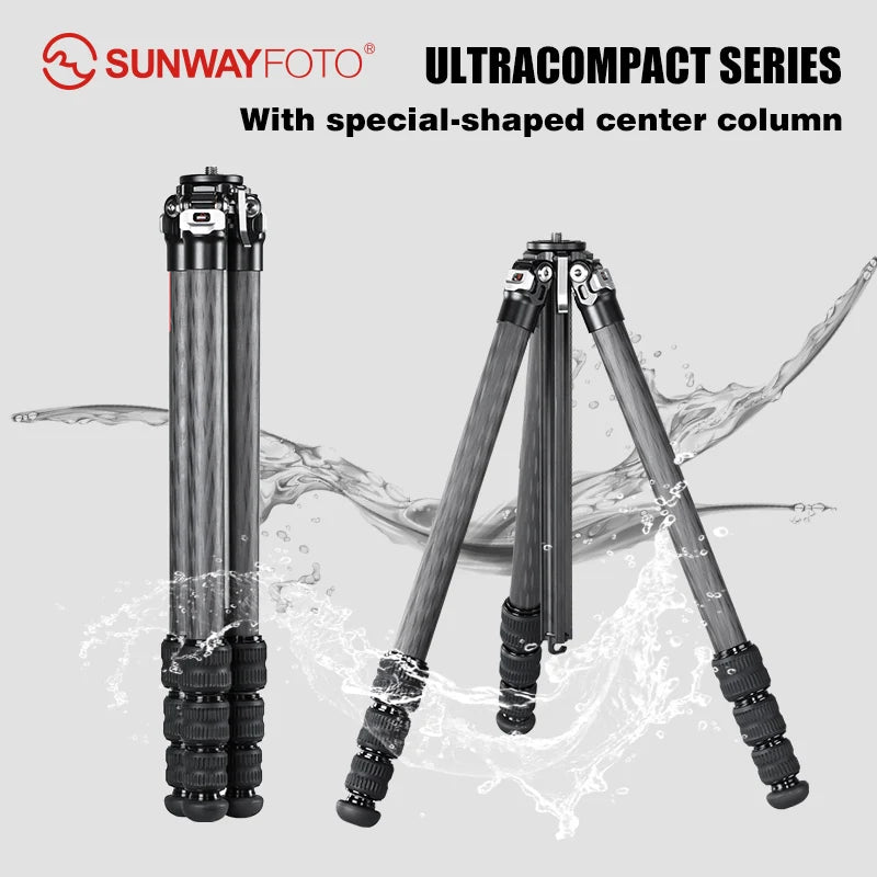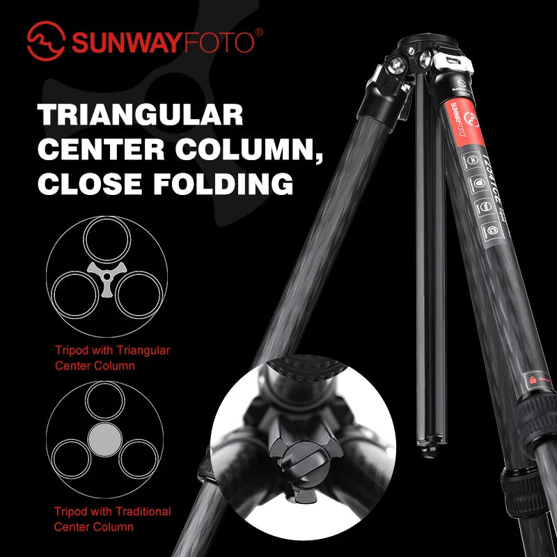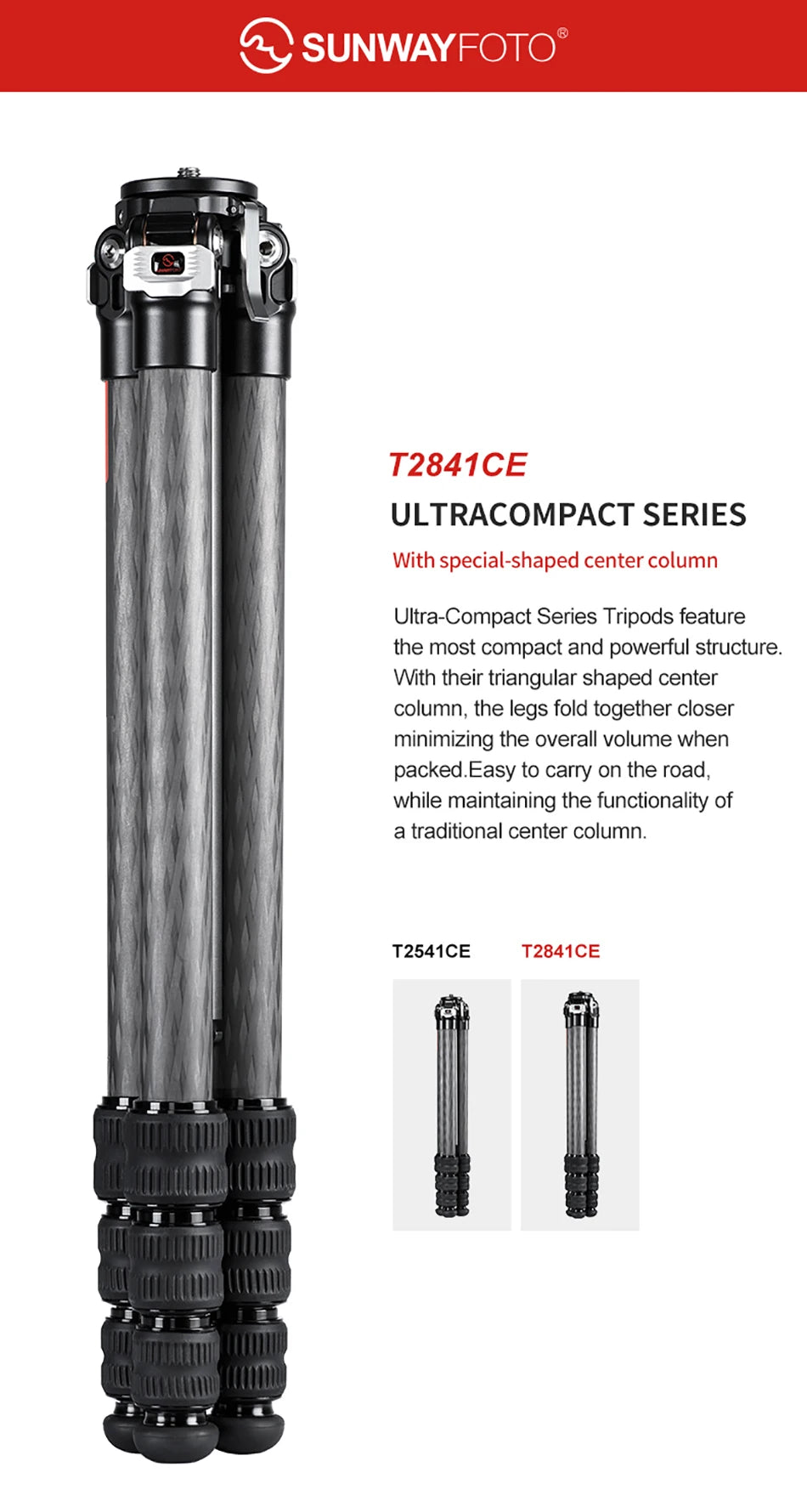 T6061 Aluminum and carbon fiber main body material, elaborately CNC machined, providing great stablity of the tripod. The triangular shaped center column ensures that the legs can fold tightly together with minimal space in-between. Compared with similar tripods the T2541CE occupies 28% less volume when packed.