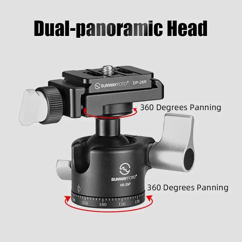 25mm ball diameter, panoramic ballhead provides adjustment in all directions. QR Plate DP-26 is included. 1/4 mounting socket on the apex to work with magic arm, mobile phone bracket, video light or microphone etc. equipment enriching the tripod functionality, simultaneous photographing, video-taking and live broadcasting.