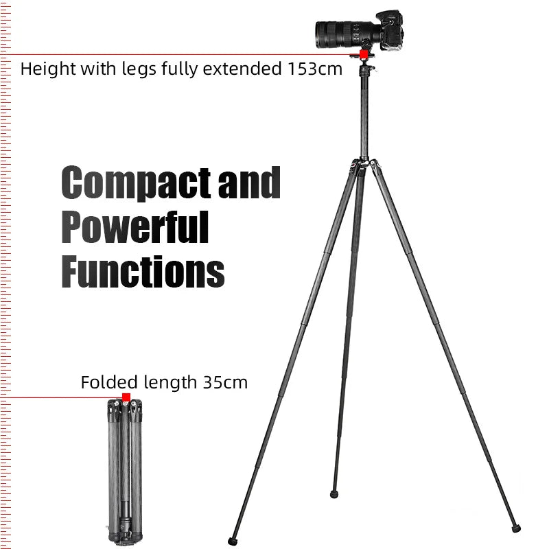 Weighing less than 1.67lb(753g)(ballhead included), max load capacity of 6.6lb(3KG), reverse-folded length only 14.2"(36cm), easily carried on the road.