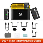This compact mic is light enough to snap on virtually anyone's collar. The charging case is designed for both charging & storing of two transmitters and the receiver for optimum use duration and portability.