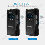 The transmitter with HDMI input and output, can output video a small monitor on the camera, allow the cameraman to clearly see the shots. The receiver with two HDMI outputs, which support simultaneous output the video.
