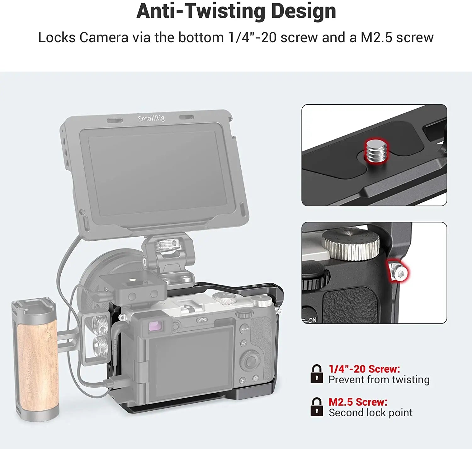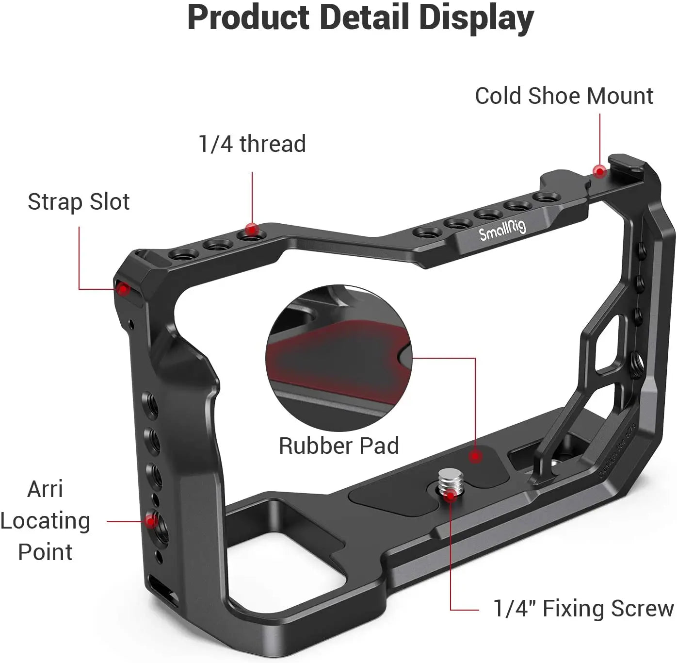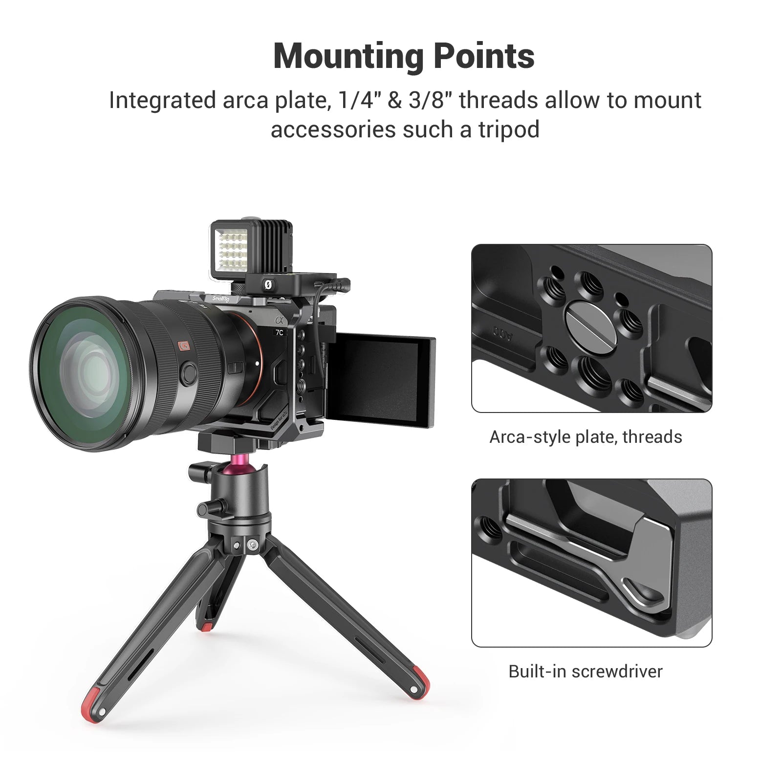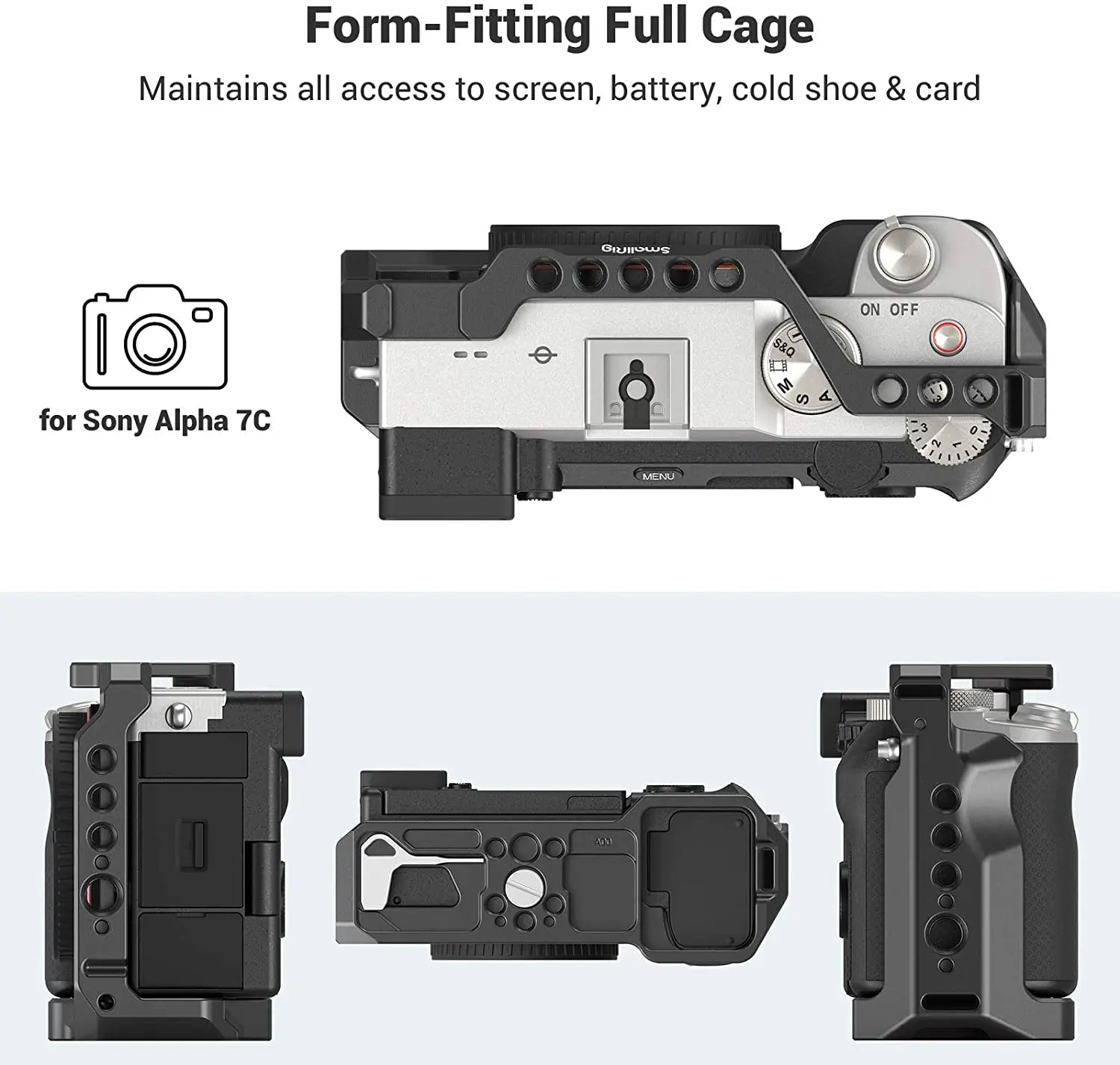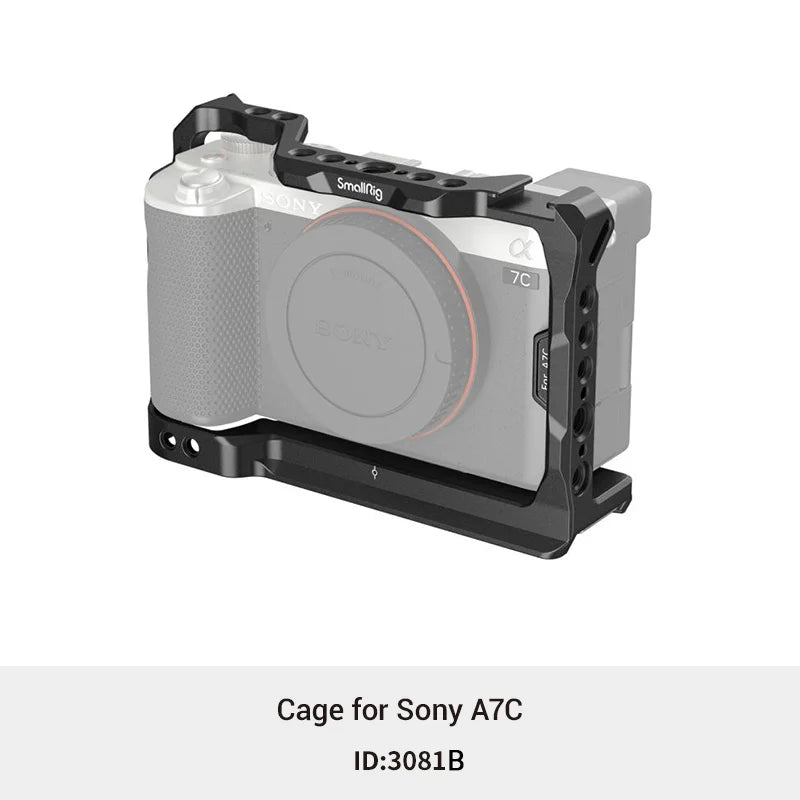 SmallRig Cage for Sony A7C 3081is a form-fitting full cage specifically designed for Sony A7C. It is lightweight and compact. To maximize the mounting options, the cage can be seamlessly integrated to the camera and features multiple 1/4”-16, 3/8”-20, ARRI thresholds, and cold shoe, which enable filmmakers to set the whole rig up within the compact body of the cage. With a built-in Arca-Swiss quick release system, the cage allows the fast switch between tripod shooting, handheld shooting, and gimbal shooting. The cage secures the camera via a 1/4”-20 screw on the bottom and an m2.5 screw on the right side to further prevent twisting. Additionally, the lightweight and ergonomic design are able to boost the grip experience to the greatest extend.