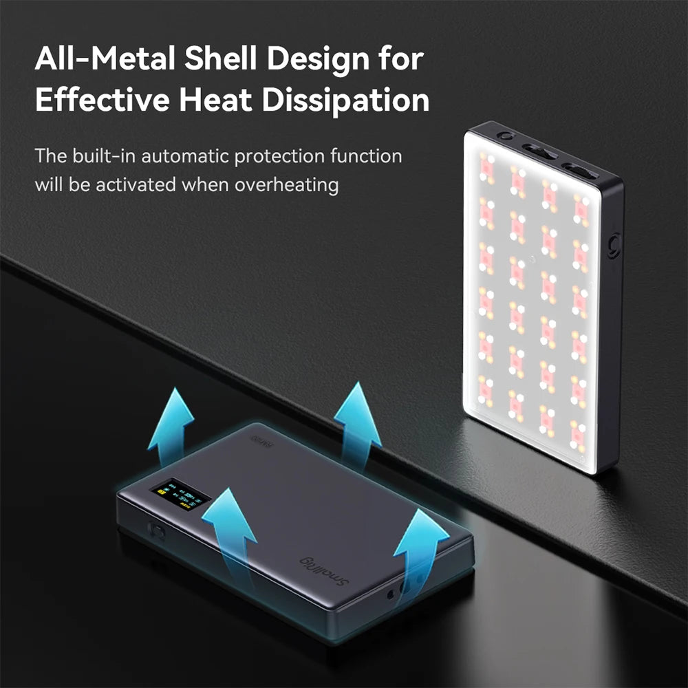 Powerful and portable, SmallRig RM120 Long-Battery-Life RGB Video Light has minimalist designand long battery life that lasts 180 minutes at maximum brightness, making it a hassle-free way of long-time shooting in various scenes. It features 0% ~ 100% brightness, 98+ CRI, 98+ TLCI, 2500K ~ 8500K color temperature, 360° Hue adjustment, 100-level saturation adjustment, and 12 lighting effects. You can simply and accurately adjust parameters shown on the integrated OLED display screen via thumbwheels, knobs, and buttons. This Video light comes with a built-in 5000mAh lithium battery, charged by the included USB-C charging cable, one anti-twist 1/4 "-20 threaded holes on one side and at the bottom to attach camera and cage, as well as a diffuser for scattering the soft light output.