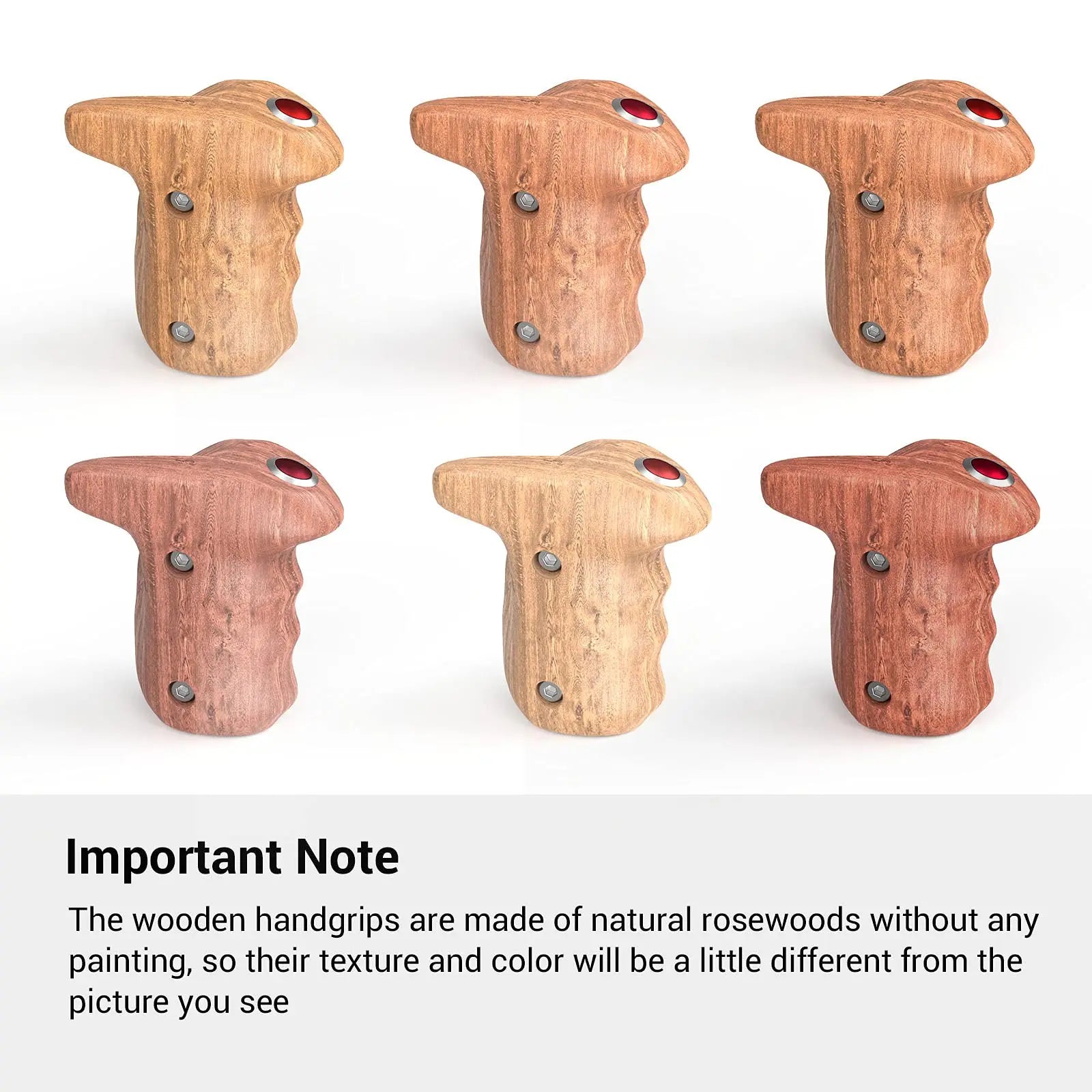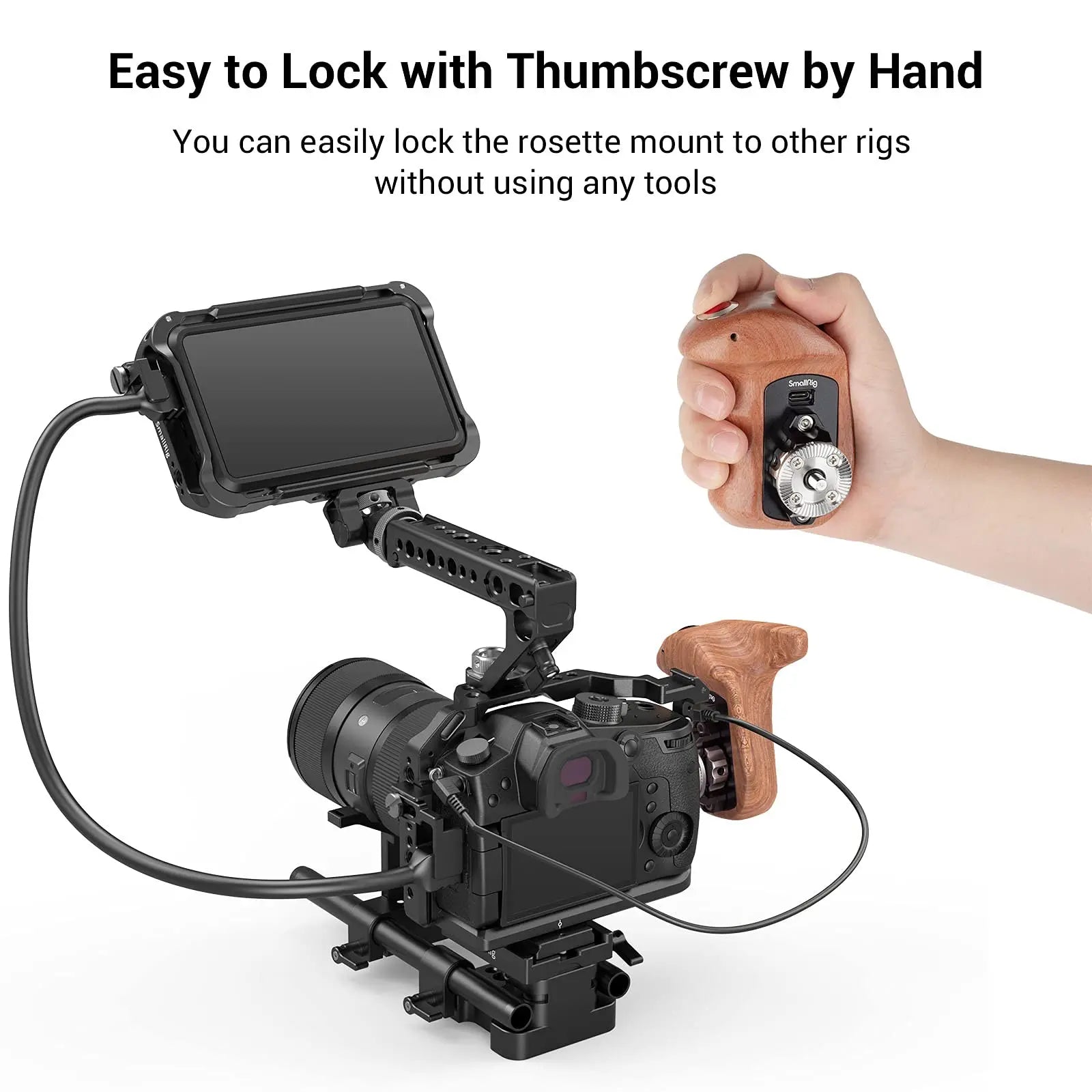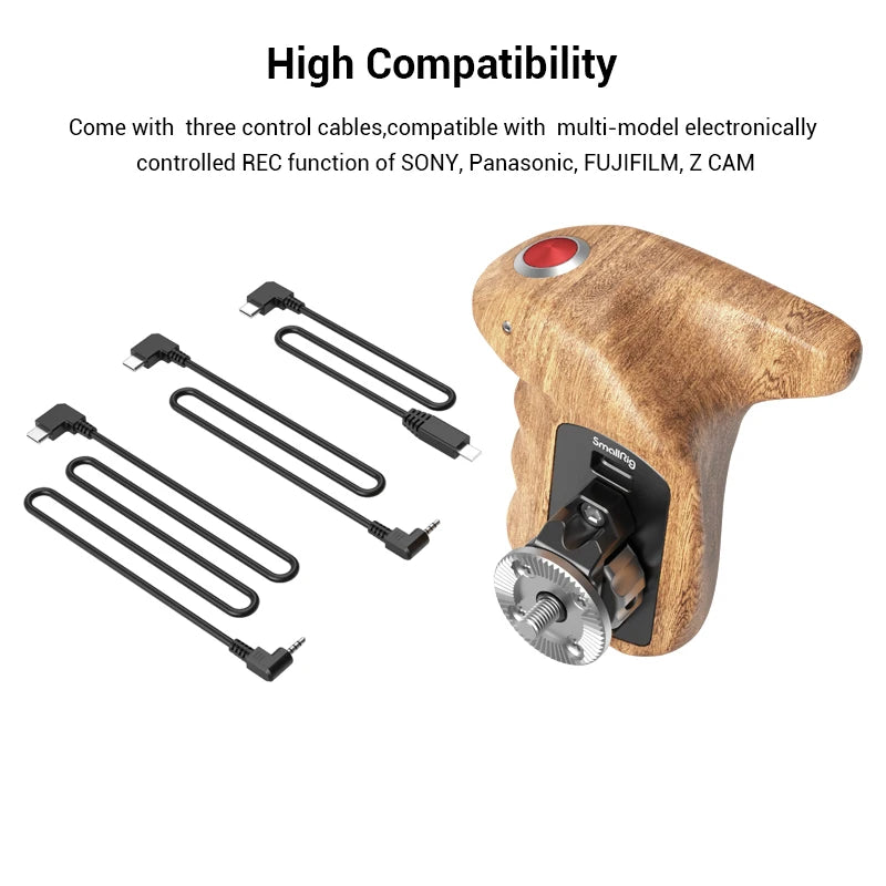 SmallRig Rosette Side Handle with Record Start/Stop Remote Trigger 3324 is designed to provide convenient record start/stop control for a stable and comfortable shooting experience. Lightweight and delicate, the all-in-one wooden handle is ergonomically designed to improve the grip experience. Its ARRI rosette helps secures the camera with 360-degree rotation. Comes with three control cables, supporting Sony A7II/A7III/A6000/A6500, Fujifilm X-T3/X-T4, Panasonic GH5/5S/G9/G95/S5/S1/S1R/S1/BGH1, and Z CAM E2/M4/S6. If you need to add a longer control cable under shoulder shooting mode by using Sony cameras, cable ID:3407 is sold separately. The handle is compatible with the following cameras and control cables: