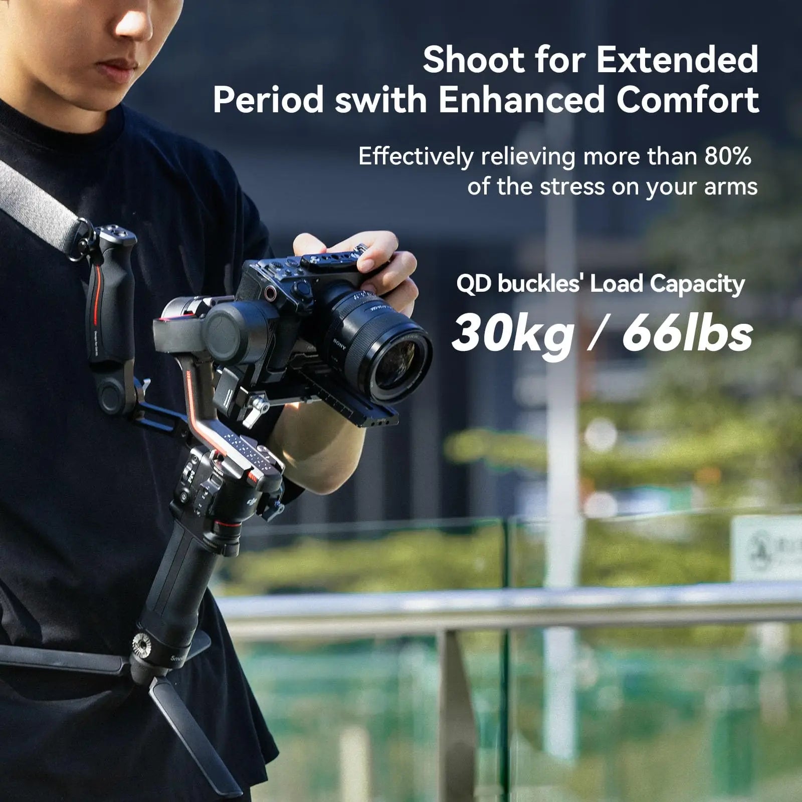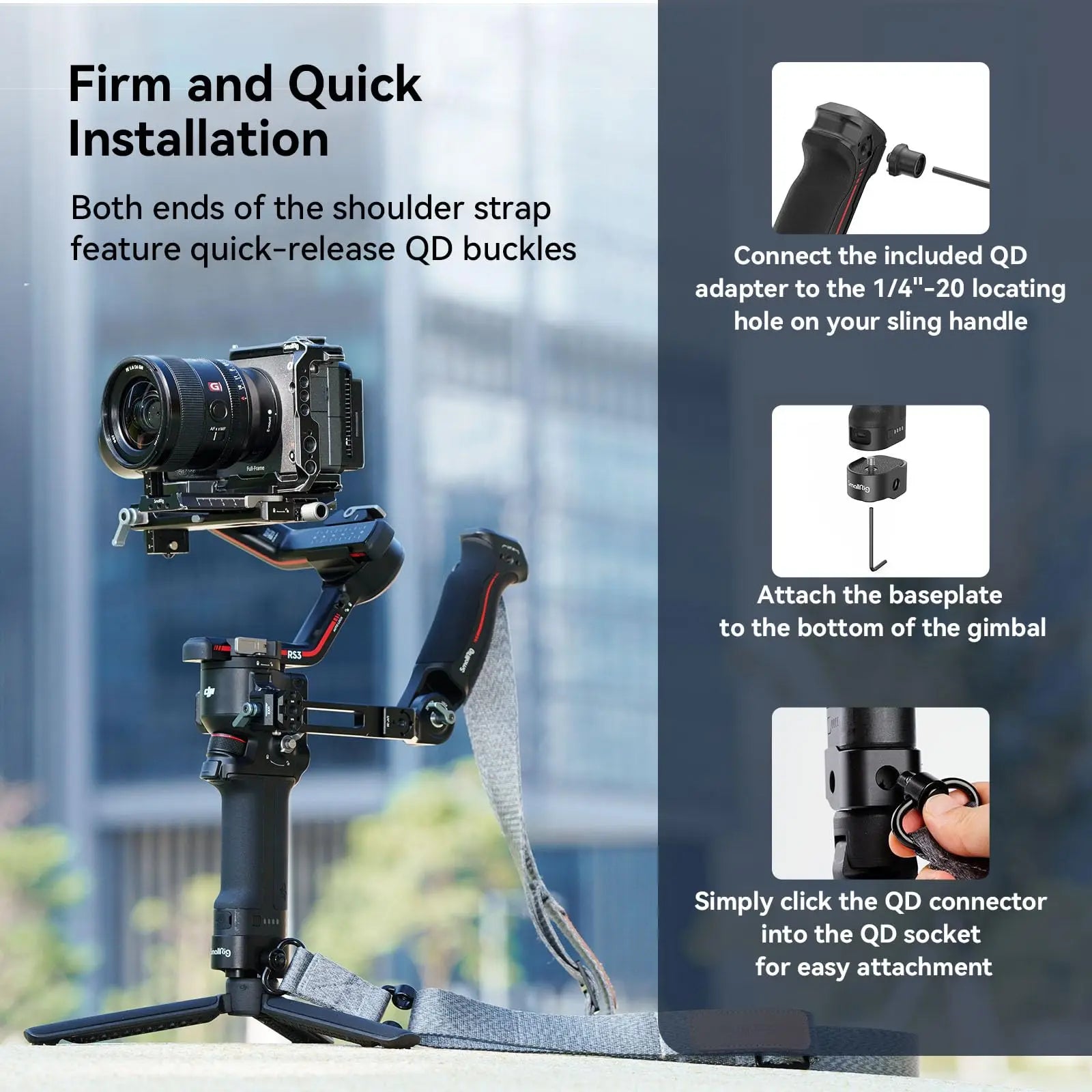 SmallRig Shoulder Strap for DJI RS 3 / RS 3 Pro / RS 2 4118 works with a sling handgrip like 3028B, 3028C, DJI sling handgrip or any other one with a 1/4"-20 threaded hole on the top to make for more labor-saving shooting. Attach the baseplate to the bottom of a DJI gimbal via the 1/4"-20 screw, sling the shoulder strap over your right shoulder, and extend the tripod. When you shoot, just pick up the gimbal; in static shot, it can release almost all stress on your arms. When you don't shoot, just let go of the gimbal and sling it against you front or against your side like a shoulder bag, reducing arm's burden. At both ends of the shoulder strap there are two QD sling swivels that support weight of up to 30kg and provide multiple mounting solutions. Two slide buckles enable easy adjustment of length. Besides, 1/4"-20 and 3/8"-16 threaded holes in the baseplate allow attaching tripods or other devices.