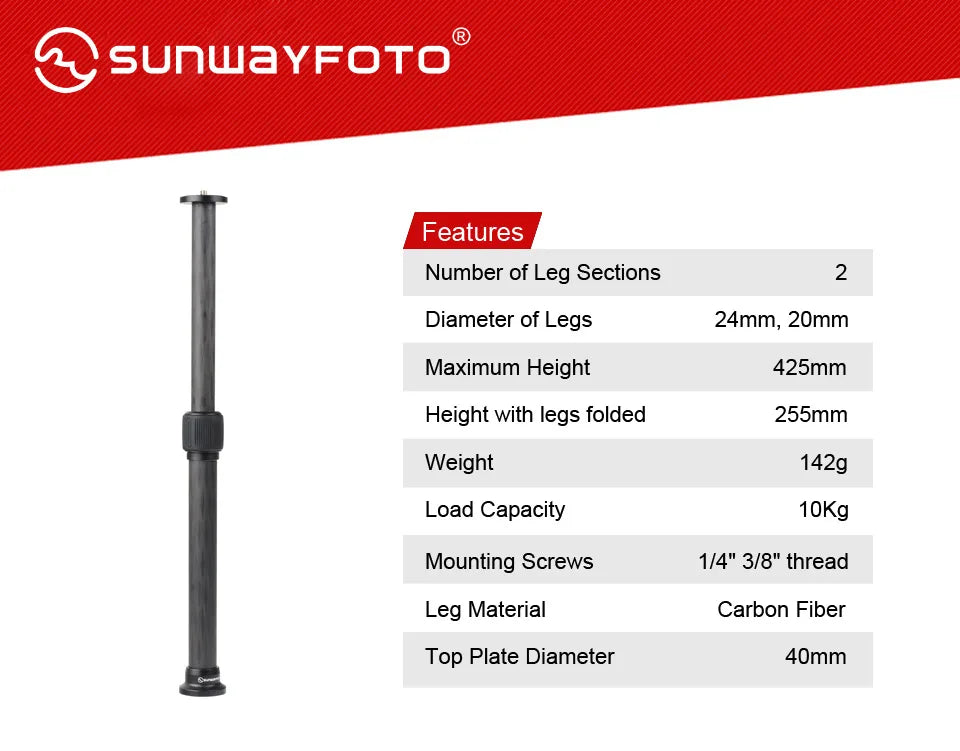 SUNWAYFOTO ET-02 Tripod Extension Tube 24mm Carbon Fiber Material for Tripod with 1/4 -3/8 Screw for Dslr Camera Accessories