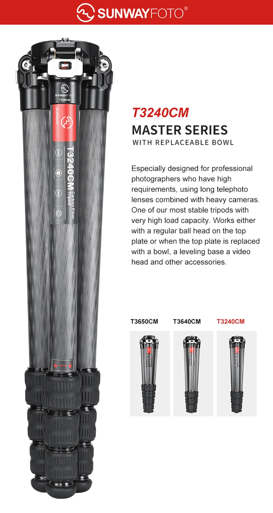 T3240CM belongs to SUNWAYFOTO Master Series Carbon Fiber Tripods. Specially designed for professional photographers who have extremely high requirements and use long telephoto lenses with heavy cameras.