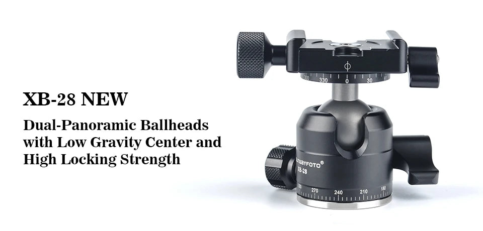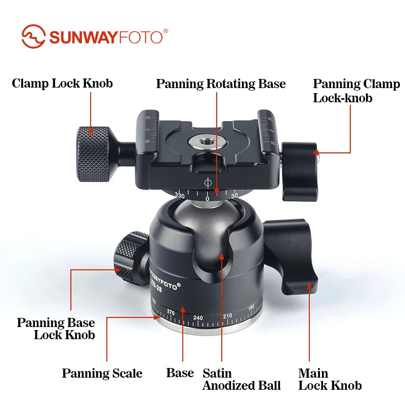 SUNWAYFOTO XB-28II classic ball head with a standard screw-knob clamp DDC-37 is CNC cutting machined from light weight aircraft-grade aluminum, stain anodized surface finish for better abrasion and corrosion resistant. Compatible with all Arca-Swiss style plates.