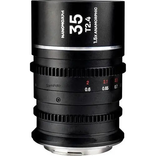 ThisLaowa Nanomorph 35mm T2.4 1.5x S35 Anamorphic LensfromVenus Opticsis a slender, compact anamorphic lens that captures high-definition video with 1.5x anamorphic squeeze on cameras with S35 sensors. It features a focal length of 35mm, a Sony E lens mount, an aperture range of T2.4 to T22 for a deep depth of field, and 13 iris blades for a shallow depth of field and soft bokeh.
