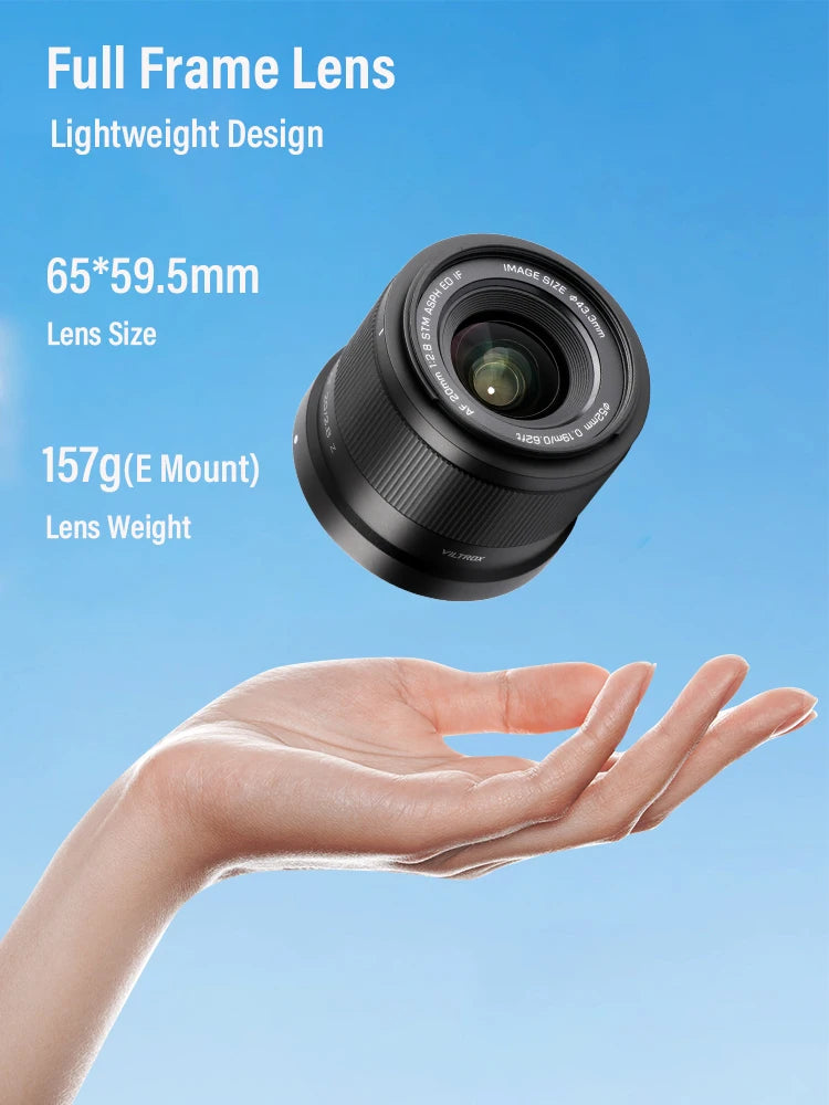 Viltrox AF 20 / 2.8 FE is an auto focus lens designed for Sony E-mount camera models. With 10 elements in 8 groups, it features outstanding optical performance. The minimum focus distance about 0.19m produces nice close-up shots. And the quiet STM focus motor can accurately control the moving position and bring accurate and smooth focusing. Great choice for portrait, landscape, close-ups and vlog shooting!