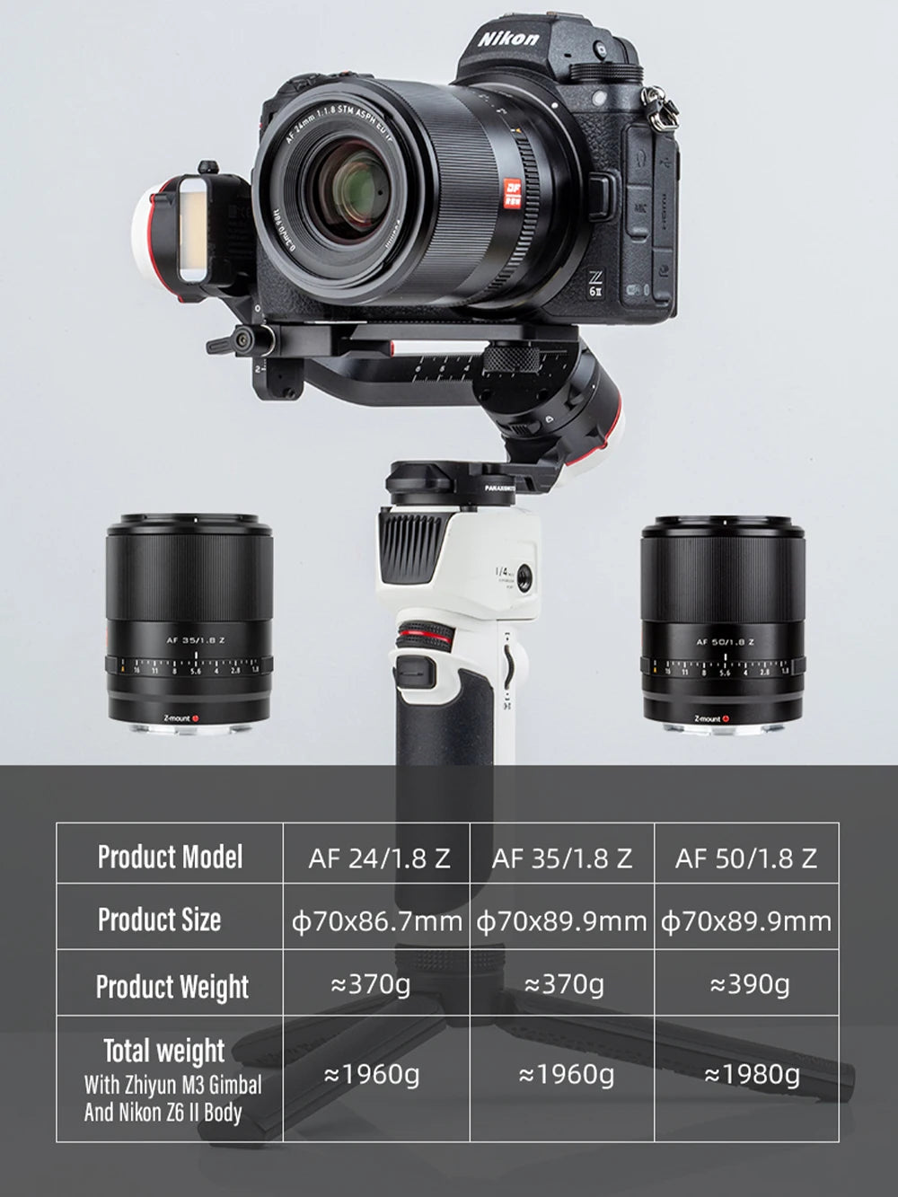 The VILTROX AF 24/35/50mm F1.4 lens is compact but solid, with a size of 70mmx90mm and a weight of about 370g .Lighten the load, which is convenient for users to go out and shoot with the stabilizer. Excellent auto focus accuracy and speed,easy to achieve a variety of sports video shooting.