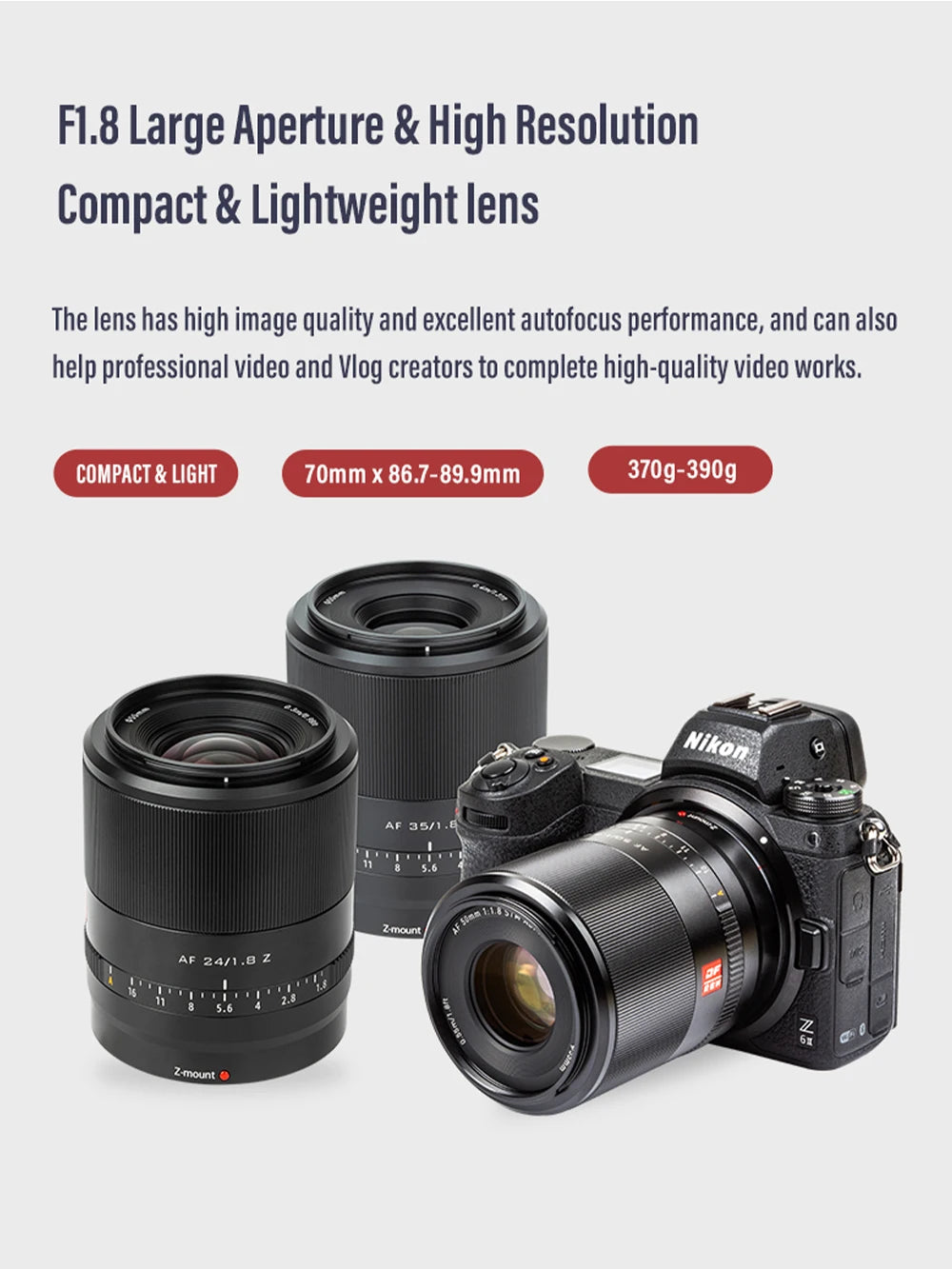 The VILTROX AF 24/35/50mm F1.4 lens is compact but solid, with a size of 70mmx90mm and a weight of about 370g .Lighten the load, which is convenient for users to go out and shoot with the stabilizer. Excellent auto focus accuracy and speed,easy to achieve a variety of sports video shooting.
